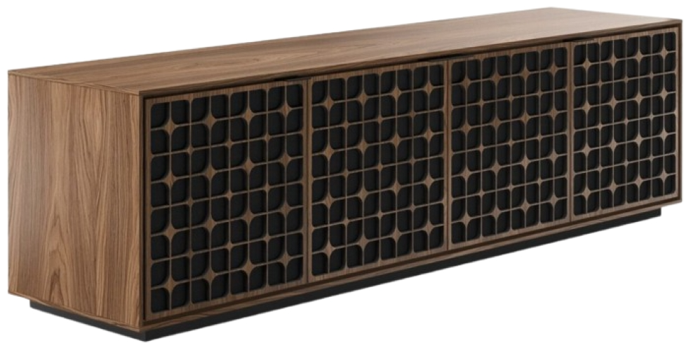 Behind elements' constellation doors, adjustable shelves and spacious interiors offer versatile storage solutions, perfect for both media components and everyday essentials. The celestial pattern not only enhances the cabinet's design but it is also engineered for acoustic transparency, ensuring flawless performance for enclosed speakers and soundbars, all while keeping your belongings beautifully organized.
