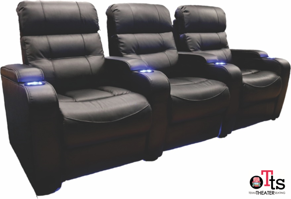 "The Austin" Premier Triple from Texas Theater Seating is a set of three powered reclining seats in top-grain leather. Each chair includes a power-adjustable headrest, under-seat blue LED lighting, and the cup holder in each arm also features LED lights. "The Austin" Premier Triple is available in black or brown.